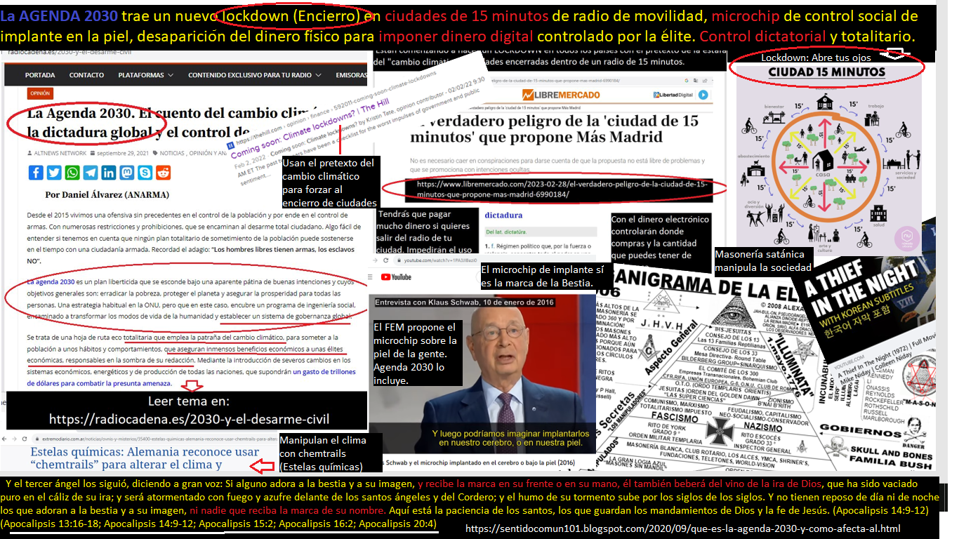 Según los periódicos van publicando sus noticias, pareciera que esto de la pandemia mundial no es una obra del azar ni de la casualidad. Pareciera que hay un plan muy bien orquestado para obligar al mundo a acatar ciertas medidas de "seguridad" programadas de antemano. Existen muchas interrogantes en torno al verdadero origen de esta pandemia. Parecen apuntar que está la mano negra de los propios gobiernos y su ejército para diseminar un virus, producir un caos y luego proponer la cura y la medicina. Un cierto caos controlado para justificar medidas rigurosas que en realidad vienen a esclavizar a la humanidad. Quieren justificar que marcar la gente como ganado por medio de la tecnología del biochip es lo más correcto. Por medio de los biochip conducirán al mundo hacia un completo control. Ningún ser humano tendrá veradera libertad pues cualquier disidencia contra el sistema puede ser eliminada. Monitoreo via satélite, sumisión a la filosofía de los políticos, una religión universal, y culto al sistema. Nadie que no se someta a dicho control extremo tendrá posibilidad alguna de progresar ni de sobrevivir. Hablan de justicia, equidad e igualdad pero prometen aniquilar a quien no se someta a su sistema. Y debemos notar que para llegar a dichos controles han traicionado al planeta por medio de genocidios, ataques, guerras, pandemias y abusos de toda clase. ¿Se puede esperar justicia alguna de aquellos que para lograr sus objetivos son capaces de asesinar? Para justificar medidas de control social como lo es el microchip, orquestaron el coronavirus y crearon un caos. Qué cosa no harán cuando la humanidad completa esté encadenada a ellos por medio de su sistema. Es por eso que la Biblia prohibe de forma contundente el que los hombres se dejen sellar o marcar por medio de esta tecnología. Más que un avance, la Biblia lo describe como una MARCA DE PROPIEDAD. El sistema masónico que controla los gobiernos le sirve abiertamente a Lucifer (Bafomet) y para ellos este sellar de la humanidad es poner el nombre de Lucifer como cosa sagrada sobre cada persona. La Biblia asegura que NO EXISTE modo de redención alguna para aquellos que se dejen implantar la MARCA DE LA BESTIA, o sea, la marca o microchip que el sistema masónico luciferino político quiere implantar en el mundo por medio de la Agenda 2030. No pierda la vida eterna dejándose poner la marca de propiedad del enemigo. Huya del sistema. Es mejor perder la vida y ser propiedad de Dios que vivir en esta tierra y ser propiedad de Lucifer. No a la dictadura del Nuevo Orden Mundial.